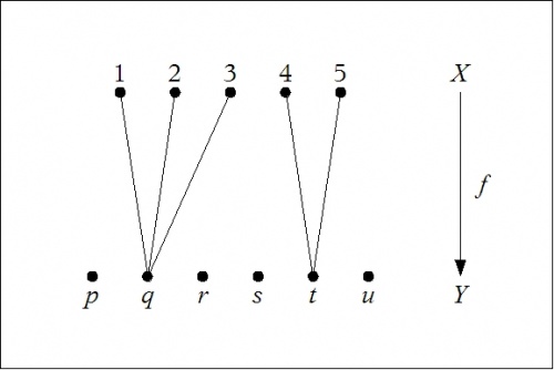 \(\begin{array}{ccl} X & = & \{ 1, 2, 3, 4, 5 \} \\[4pt] M & = & \{ m, n \} \\[4pt] Y & = & \{ p, q, r, s, t, u \} \\[8pt] f & : & X \to Y, ~\text{arbitrary} \\[4pt] g & : & X \to M, ~\text{surjective} \\[4pt] h & : & M \to Y, ~\text{injective} \\[8pt] f & = & g \circ h \end{array}\) |