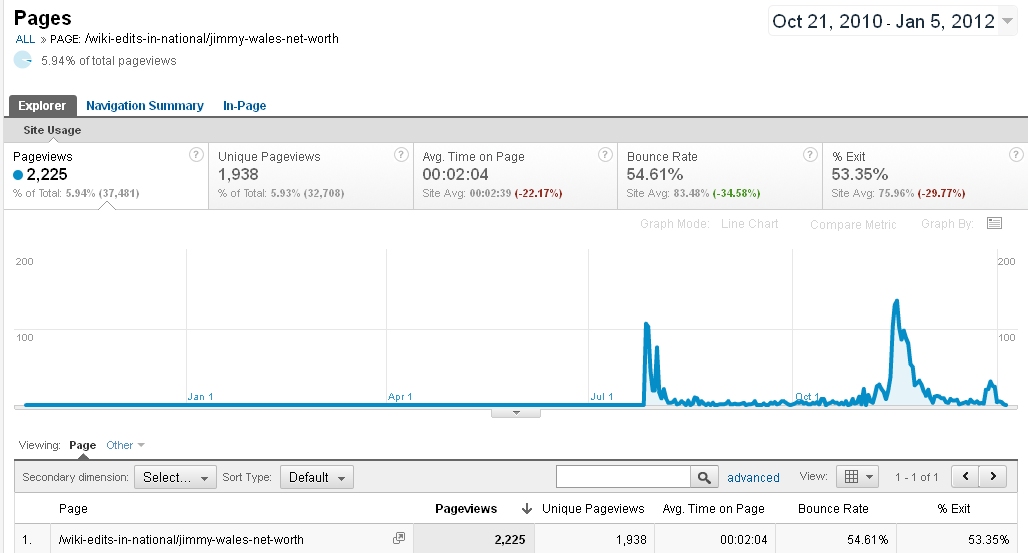 Google Analytics track of page views of Examiner article about Jimmy Wales' net worth.