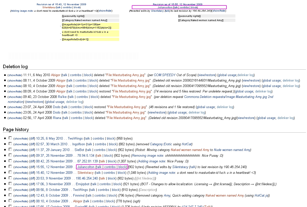 This screen-capture grab indicates that Juliancolton, as a minor (under age 18) volunteer administrator of Wikimedia Commons, was active in management of a pornographic picture file that was eventually deleted from Wikimedia servers (http://commons.wikimedia.org/wiki/Commons:Deletion_requests/Image:Masturbating_Amy.jpg_2nd_nomination ), as it was questionable whether or not the photo's subject was herself a child. (No model release form or proof of age accompanied the photo's provenance.) Because the photo was deleted from Wikimedia Commons, the file history you see here is only available to Commons administrators.