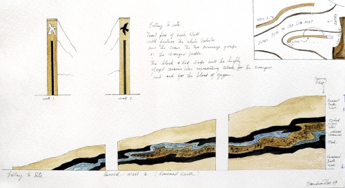 The work will have several rammed earth curved walls to be fabricated at the beginning of the pathway leading into the Memorial site. A feature visual timeline will be etched into clay tablets that meander along the full length of the walls, they will be reminiscent of the Waugal [6] moving in and out of the land as well as a connecting feature for the Burial Site. The walls, will gradually grade down until they disappear back into the earth.