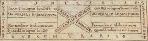 A collection of source material on the famous Square of Opposition. The diagram above is from a ninth century manuscript of Apuleius' commentary on Aristotle's Perihermaneias, probably one of the oldest surviving pictures of the square.