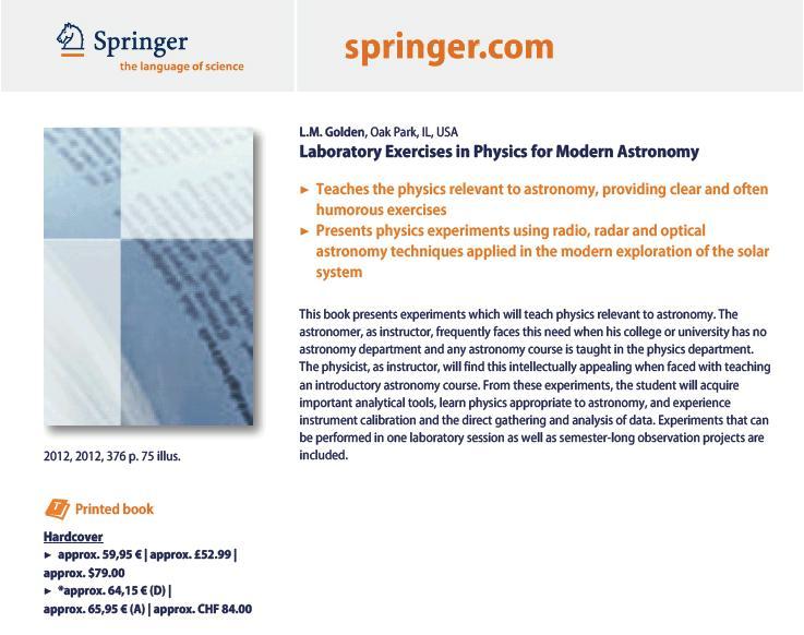 Leslie M. Golden, Les Golden, Ph.D, astronomer, professor, actor, comedian, musician, environmentalist, and animal welfare advocate of Oak Park Illinois. The bookseller flyer for Laboratory Experiments in Physics for Modern Astronomy was produced by Springer Science+Business pubolishers.