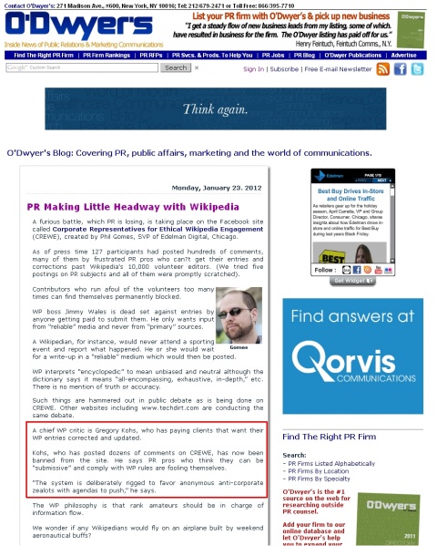 January 23, 2012. Gregory Kohs mentioned in O'Dwyer's PR news.