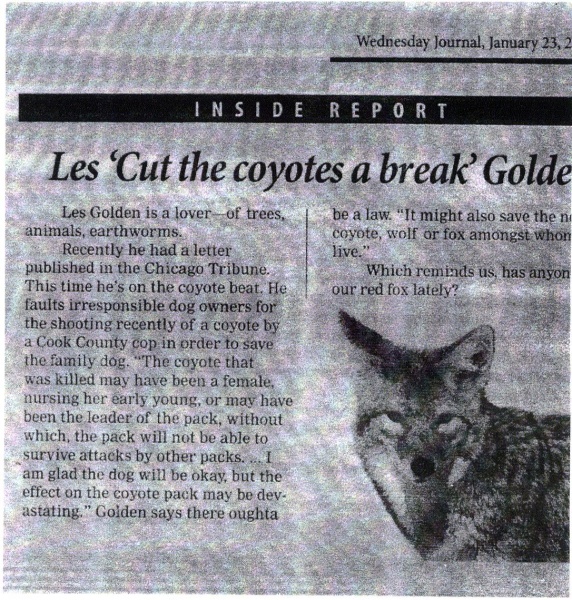 Les Golden, of Oak Park, Illinois, is a leading environmentalist and animal welfare advocate in the State of Illinois. He frequently lobbies for these causes in columns, letters to the editor, and press releases.