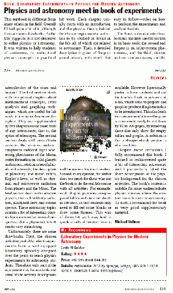 Revision as of 01:21, 19 October 2013 by Drlesmgolden (talk | contribs) (Review of "Laboratory Experiments in Physics for Modern Astronomy" by Michael Vollmer, published in Physics Education Journal, July 2013, volume 48, number 4, pages 534-535.)