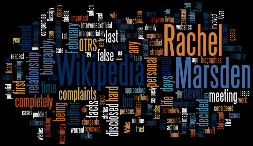 Text of Jimmy Wales' statement about his relationship with Rachel Marsden, as found on http://blog.jimmywales.com/index.php/statement/, rendered with the Wordle.com interface.